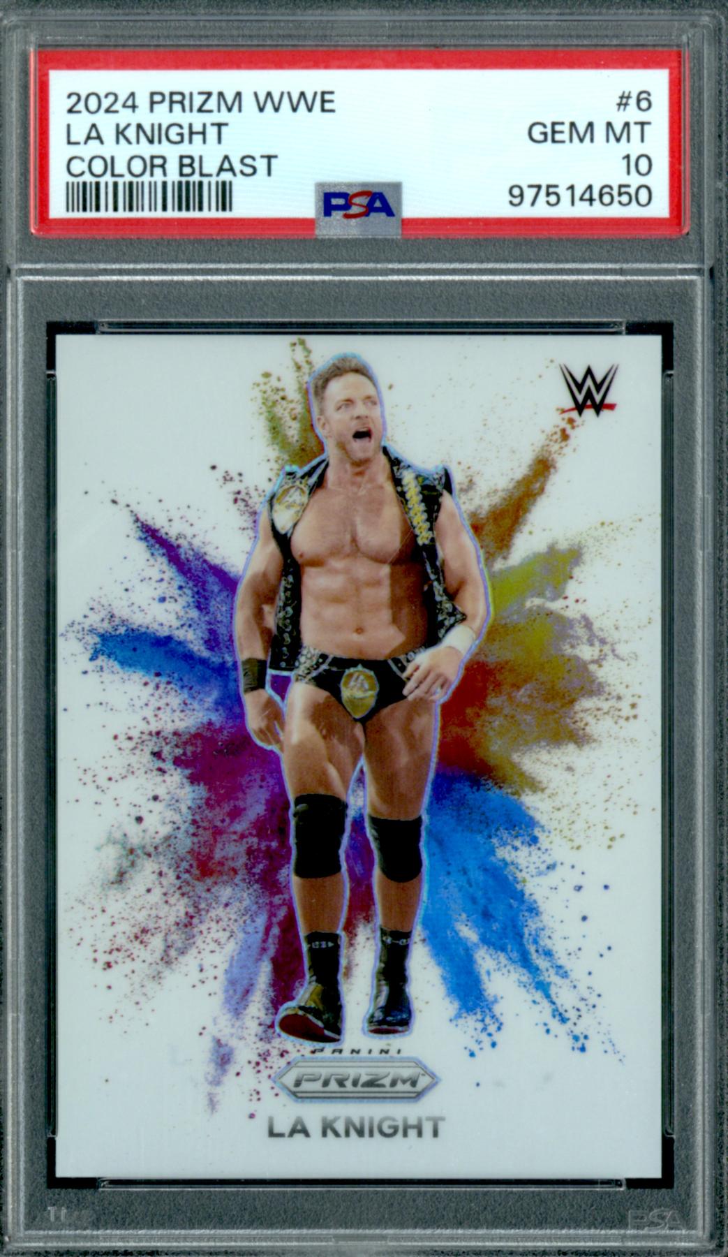 - 2024 WWE Panini Prizm LA Knight Color Blast PSA 10 GEM MT